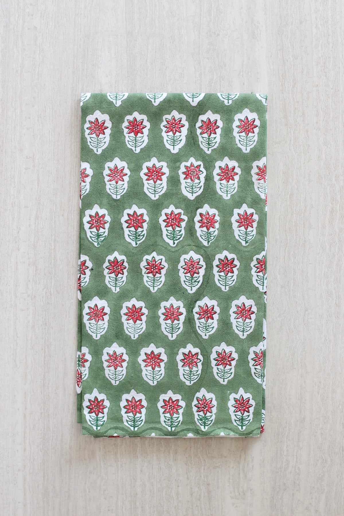 Hand block printed by survivors of modern day slavery. Tea Towel - Poinsettia, Sage & Red