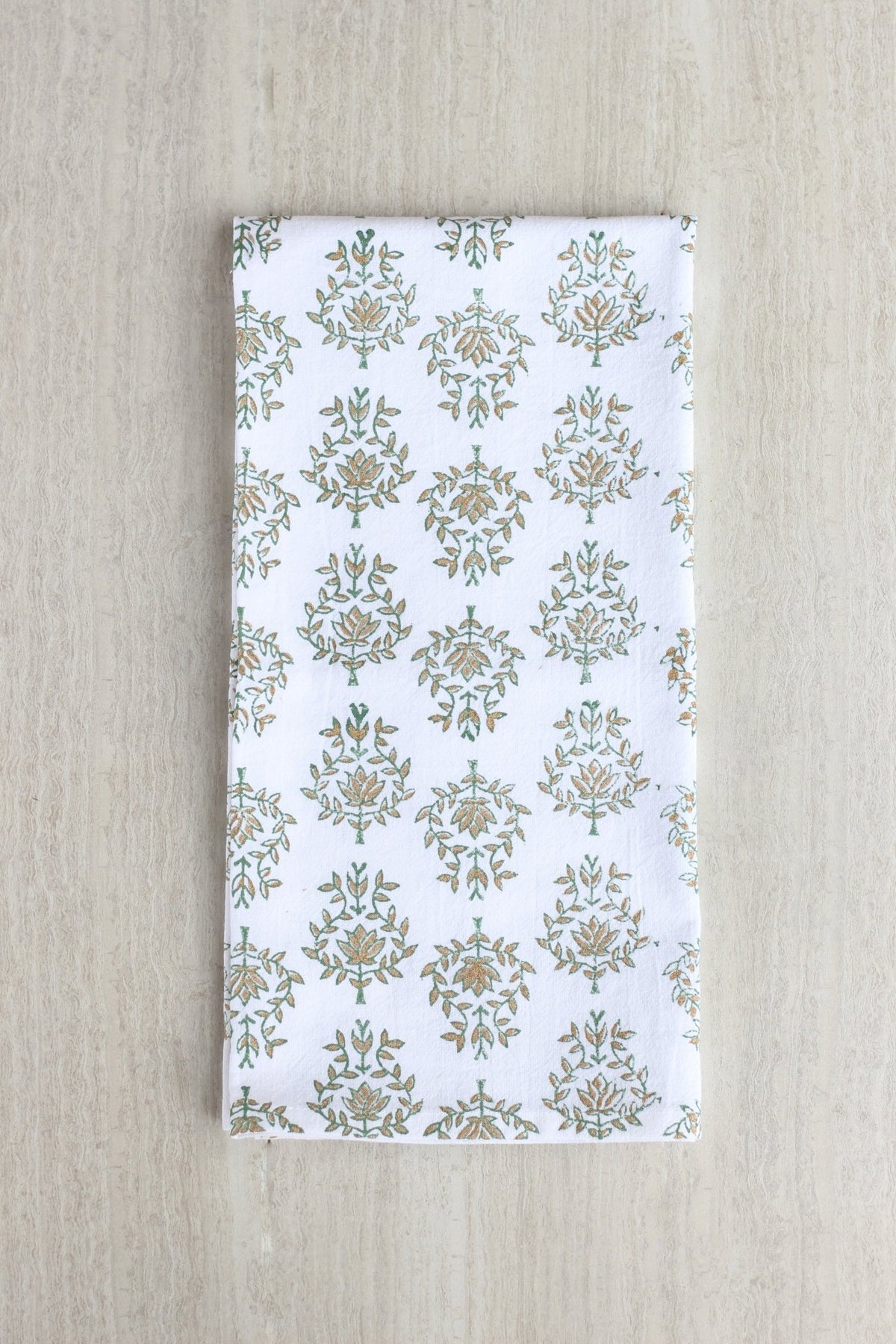 Hand block printed by survivors of modern day slavery. Lotus - Evergreen & Gold
